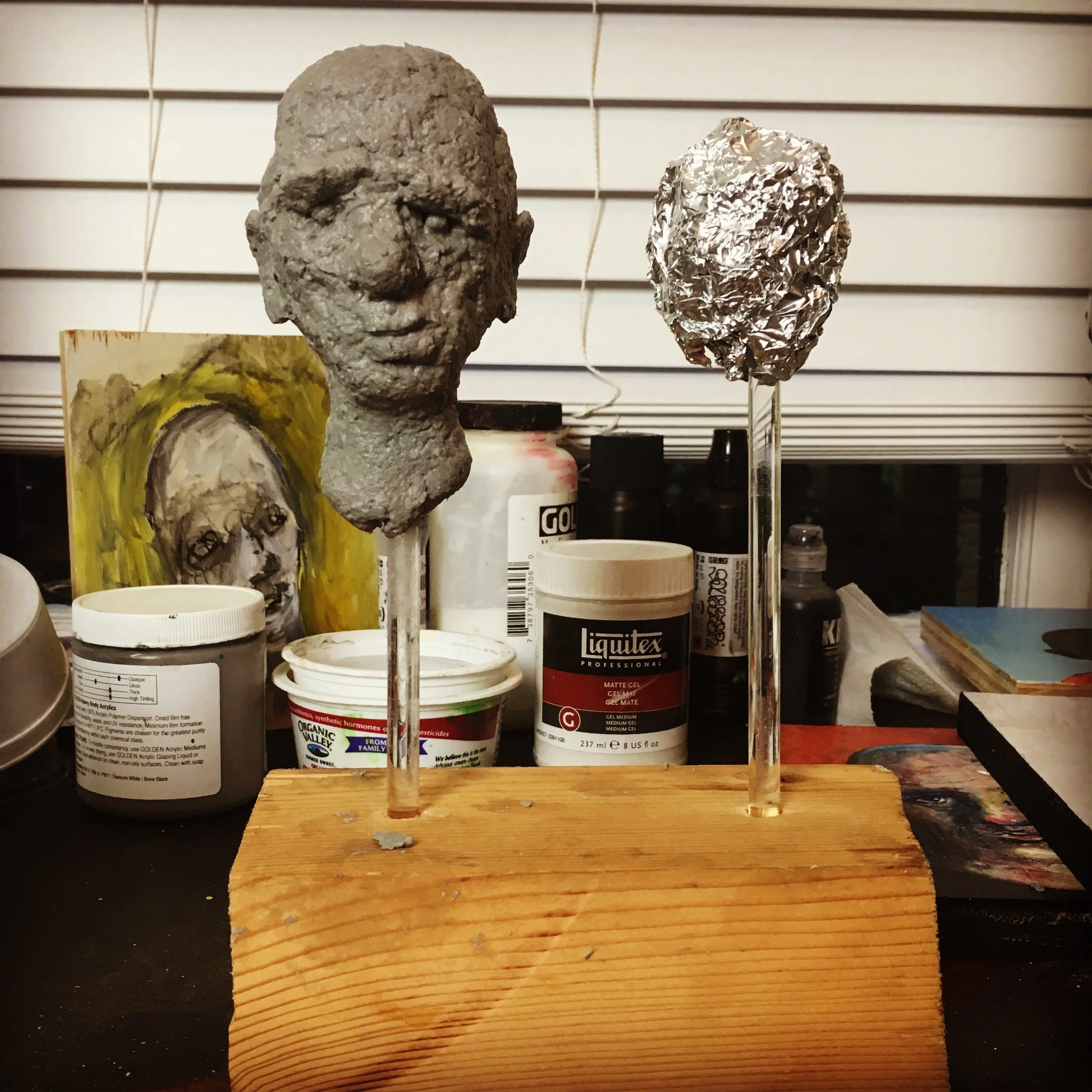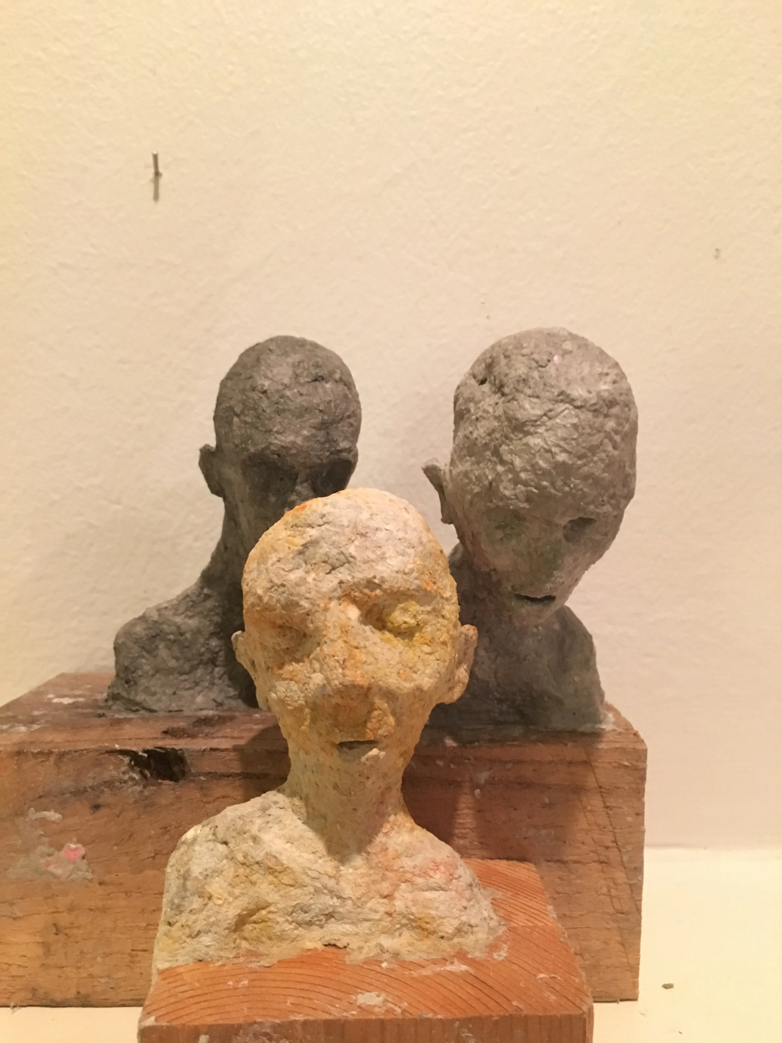 I make small portraits and sculptures of imagined people — the kind you might pass on the street and wonder about later. Some have a name and a scrap of story: a kid writing fantasy late at night, a woman waiting for a husband who may not come back, a bartender hoping to be noticed.