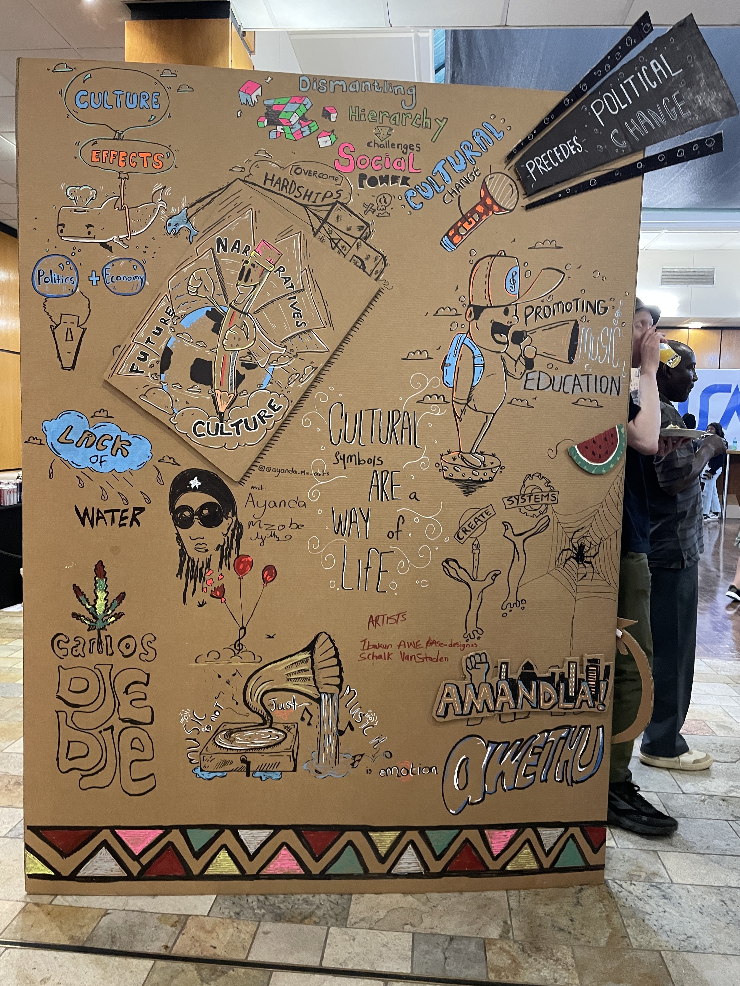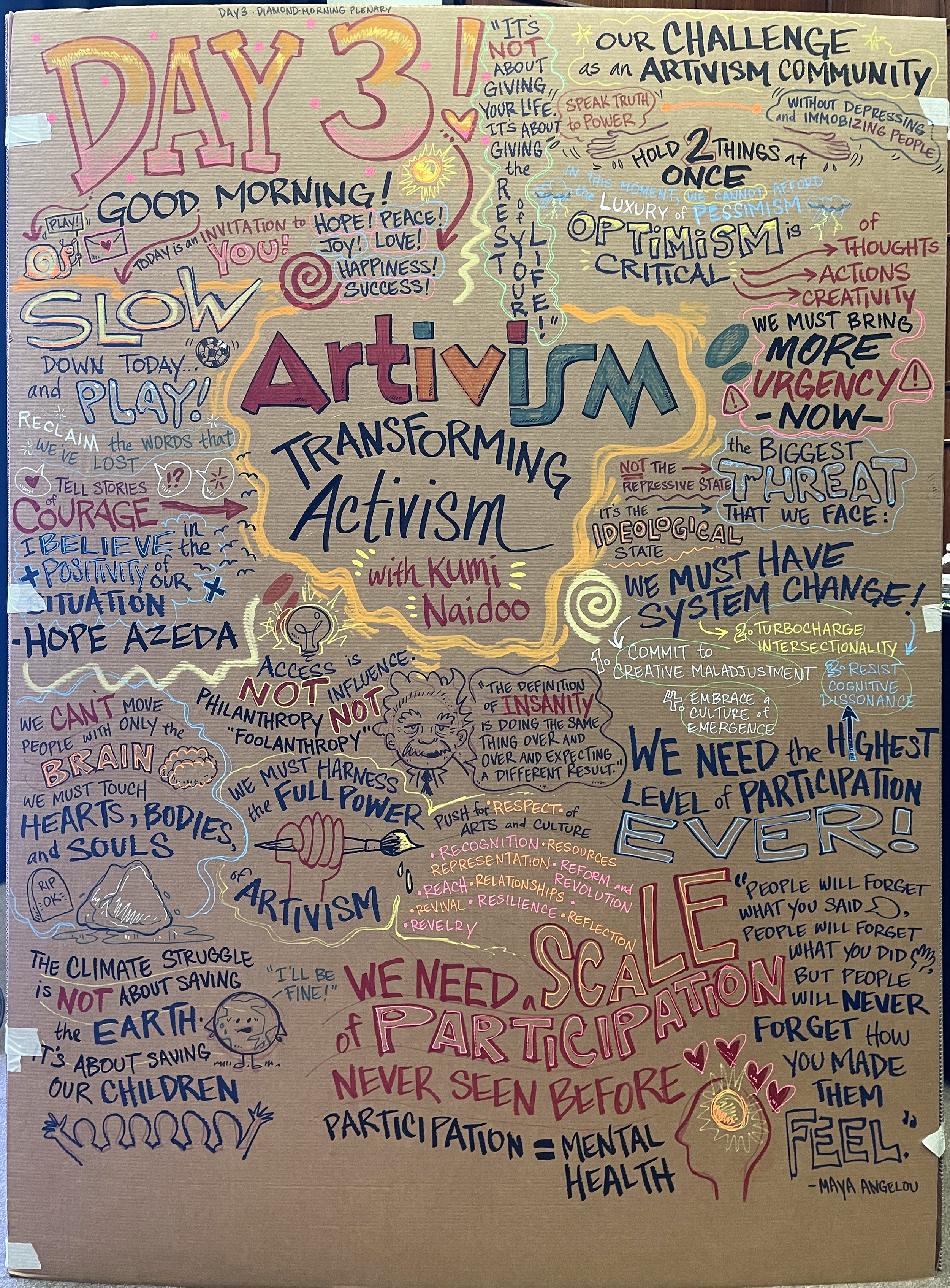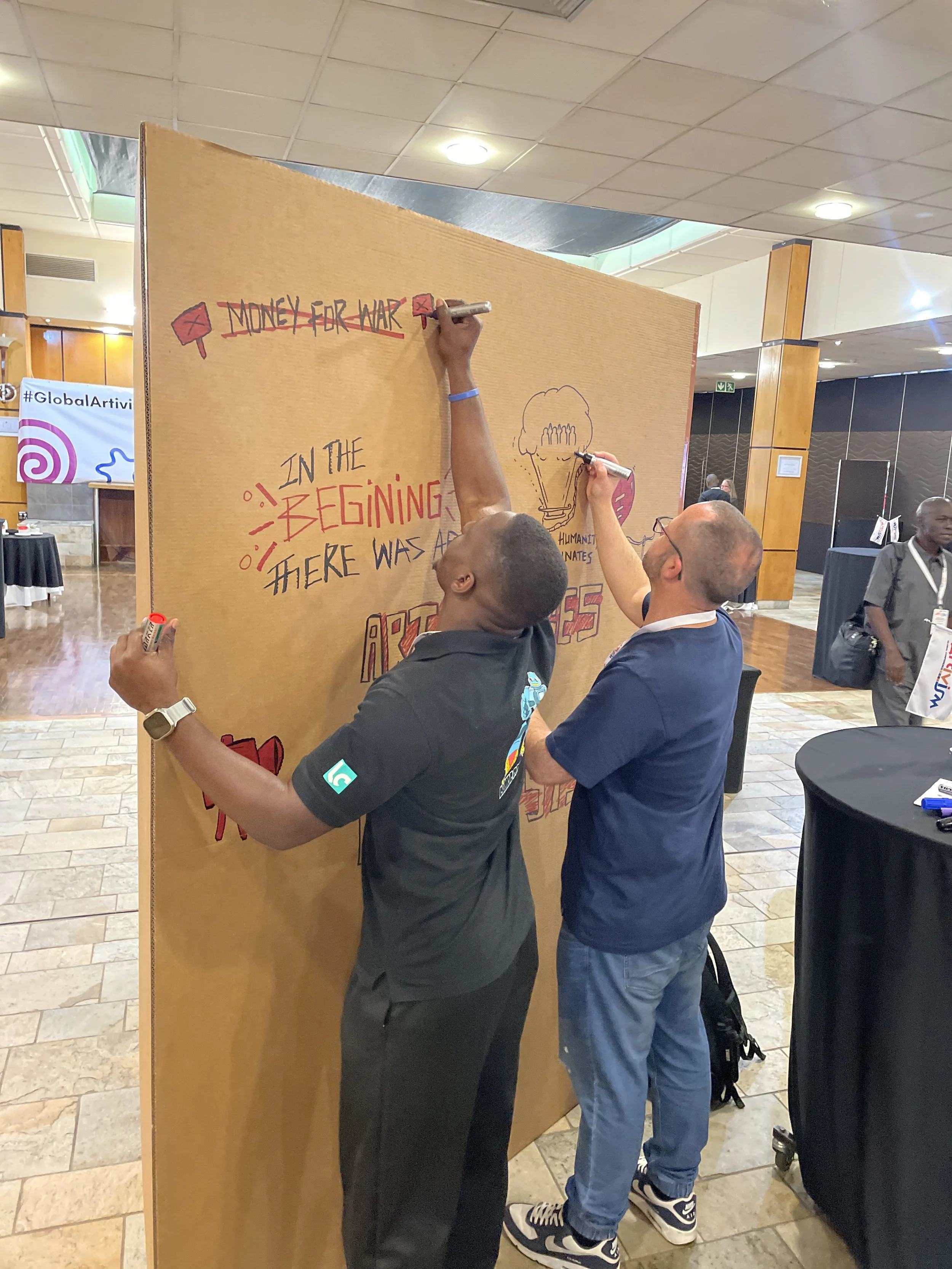 In 2024, I had the great pleasure of partnering with The Global Commons Alliance, The Riky Rick Foundation for the Promotion of Artivism, and The Community Arts Network to carry out graphic recording for the inaugural Global Artivism Conference in Pretoria, South Africa. Nicole Okumu (of Grey Area Collective and Dpict) and I also had the pleasure of training up 12 amazing local college art students to perform graphic recording alongside us.