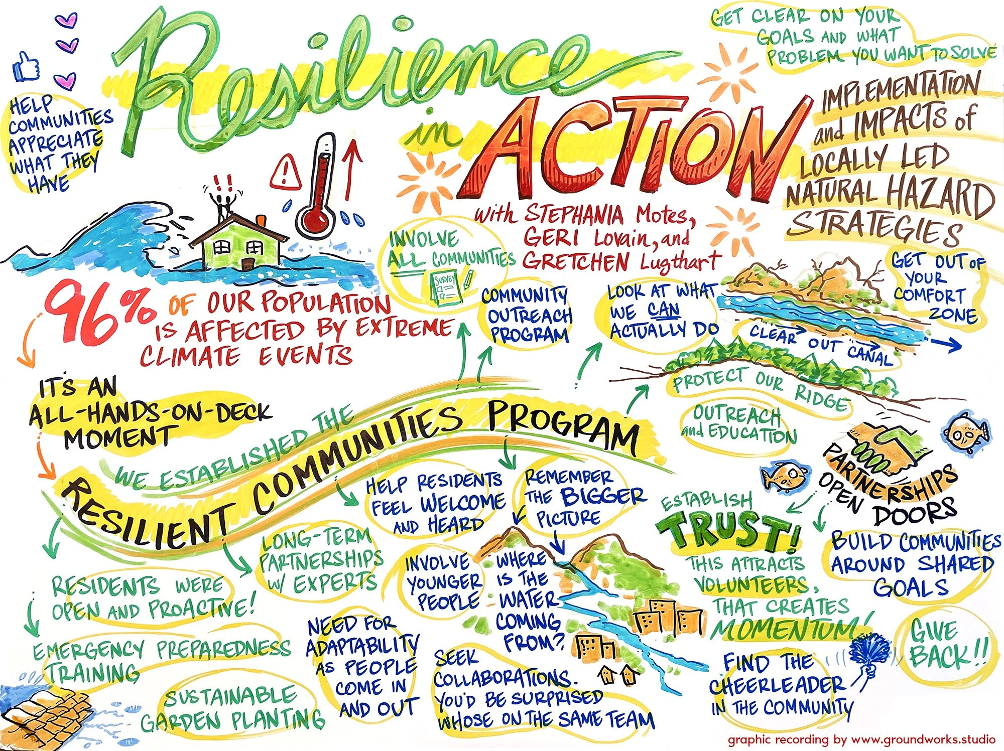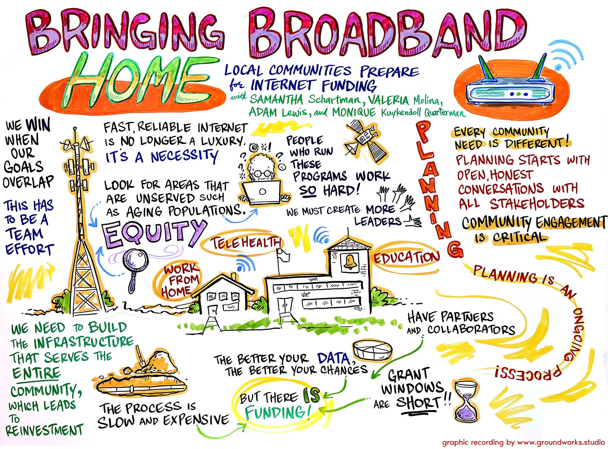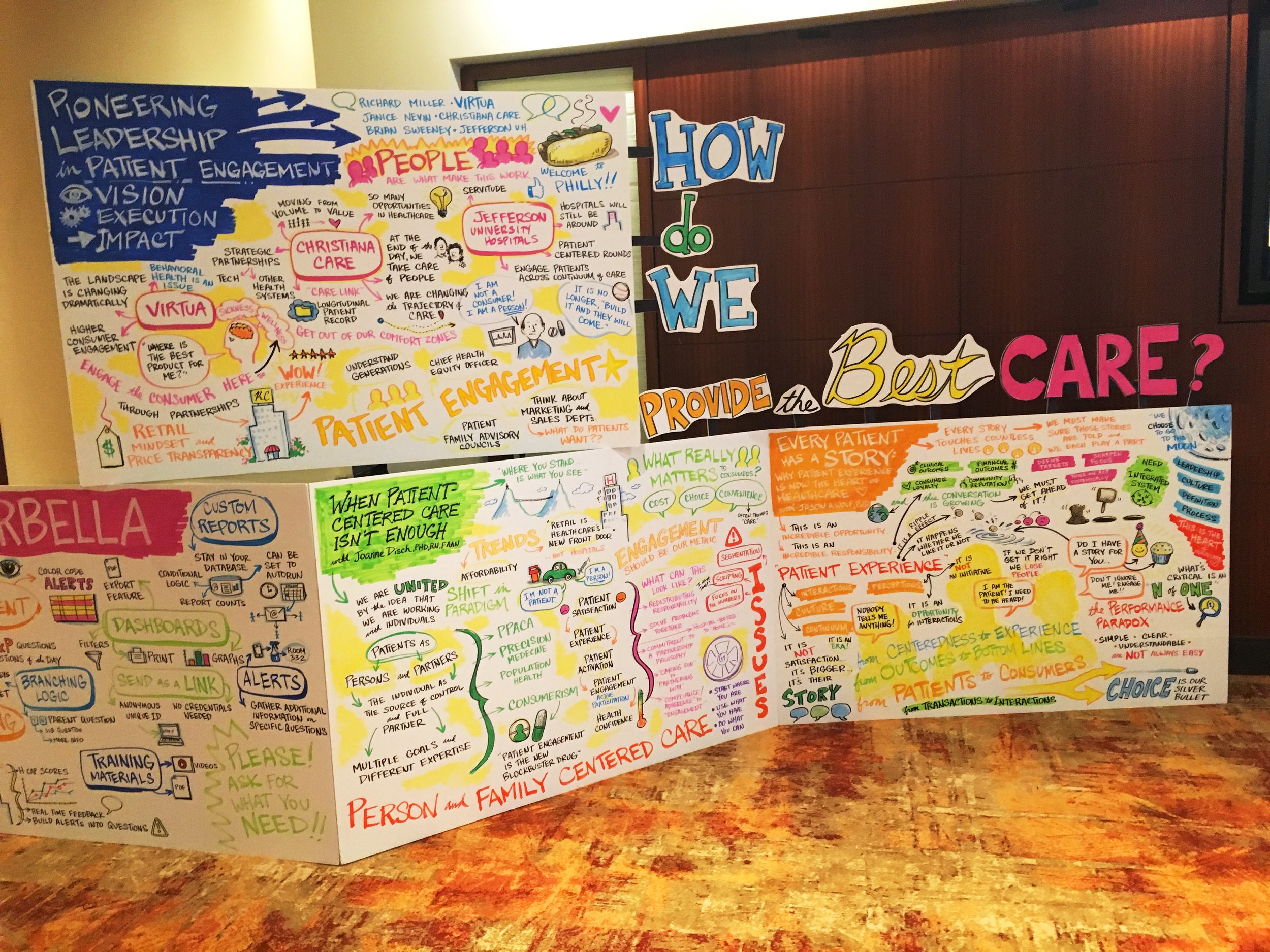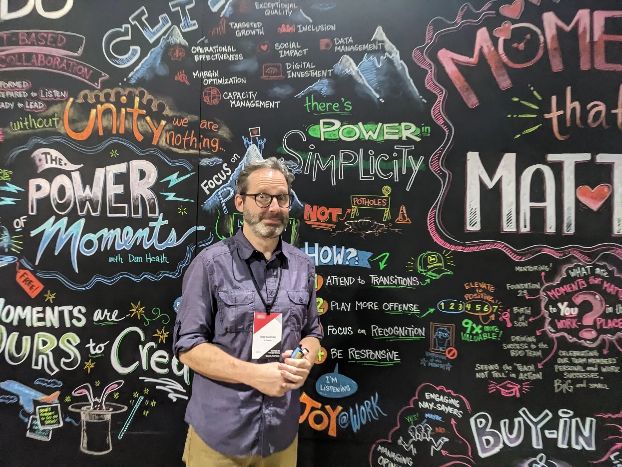 While Graphic Recording, I listen to what's happening around me; and in the moment, I draw it, map it, and filter it through metaphors and images, looking for connections, themes, and insights to bring to life. I do this live and in front of an audience, or maybe off to the side a bit. The result is a real-time visual depiction of the experience.