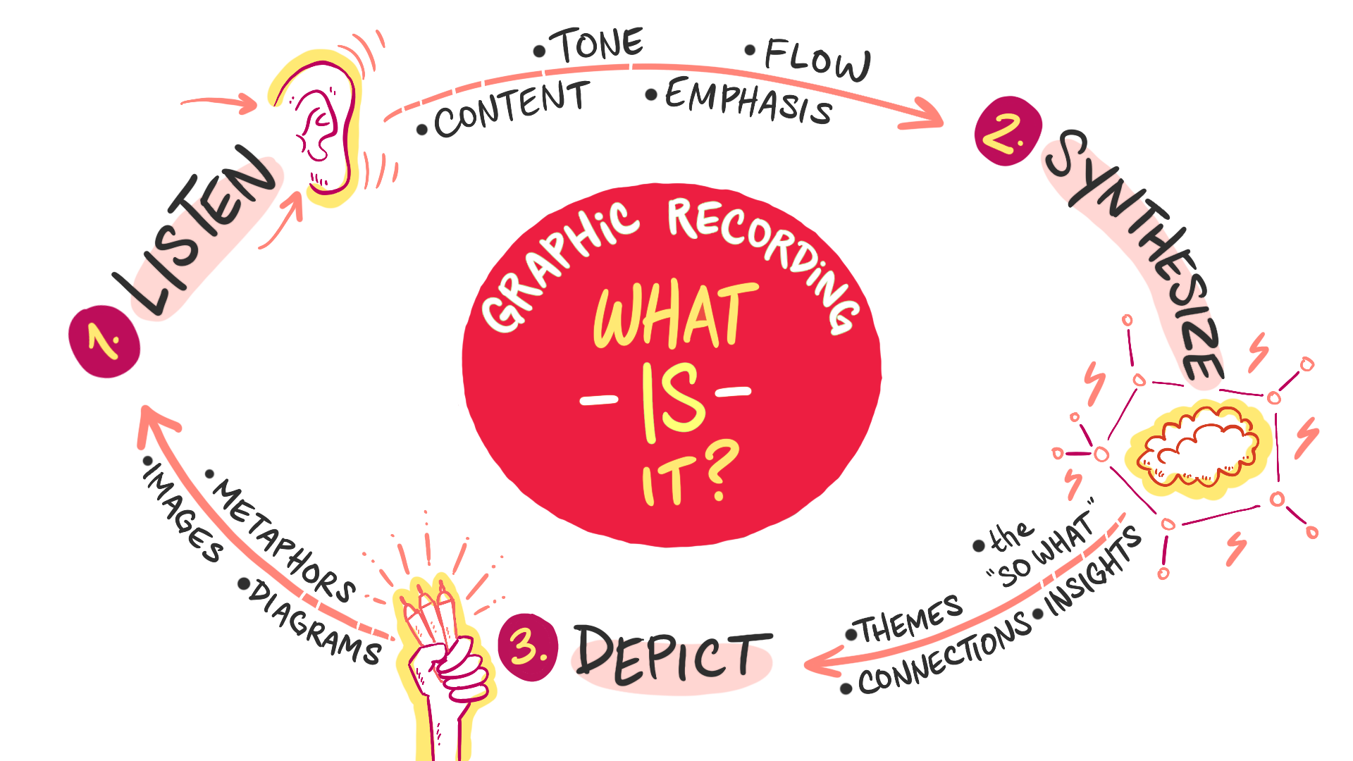 While Graphic Recording, I’m doing three things simultaneously. I’m listening to everything that’s being said, both explicitly and implicitly. I’m listening for both content and tone - how does the person feel about what they’re saying? Then in real time, I’m synthesizing all of that content and looking for connections, themes, and the “so what?” ideas that bubble up. From there, I’m depicting those elements visually on the board or screen to create an artful, engaging map of the overall themes, tone, and key moments of the dialogue.