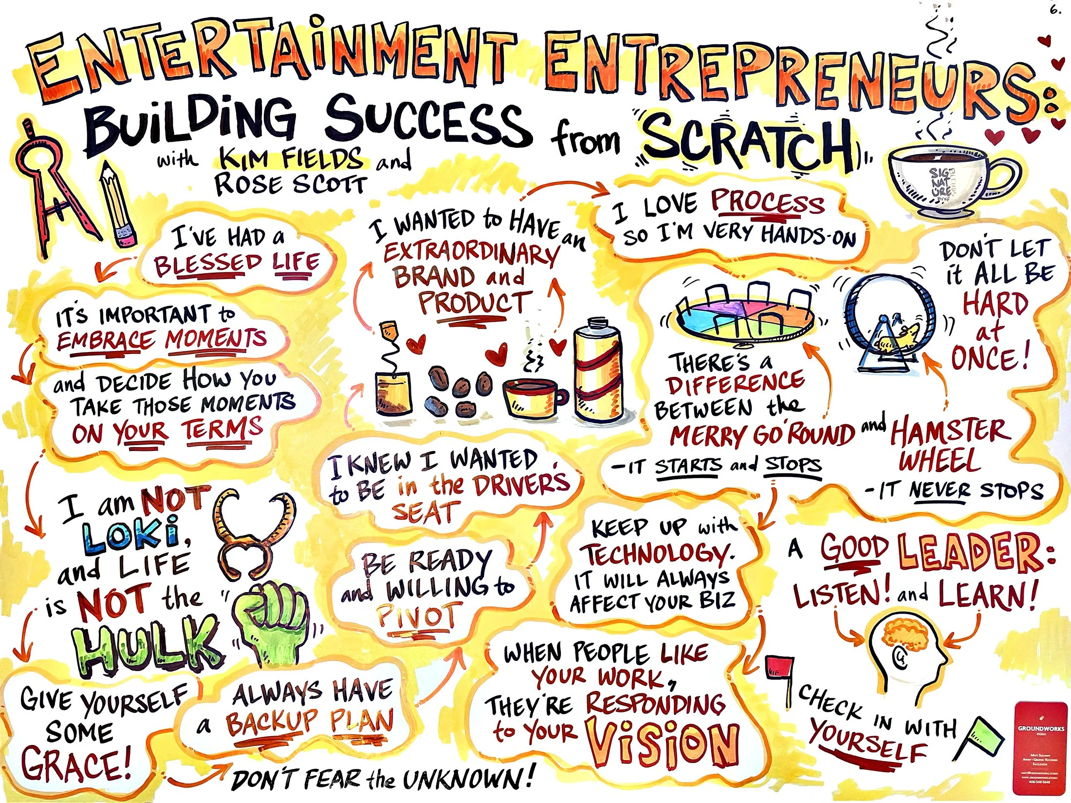 While Graphic Recording, I listen to what's happening around me; and in the moment, I draw it, map it, and filter it through metaphors and images, looking for connections, themes, and insights to bring to life. I do this live and in front of an audience, or maybe off to the side a bit. The result is a real-time visual depiction of the experience.